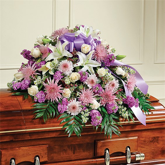 When we lose someone dear to us, we want to respond with a fitting gesture of respect and admiration. Our half casket cover, crafted with care and artistry by our expert florists with lavender cremones, mums, white roses, and accented with a lavender satin ribbon, is an unforgettable way to commemorate a lifetime of loving devotion.